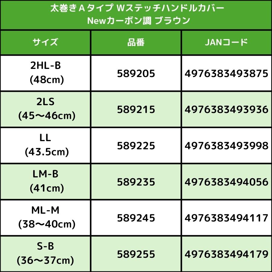 | 2HL-B(48cm) | 589205 | 4976383493875 | 2LS(45〜46cm) | 589215 | 4976383493936 | LL(43.5cm) | 589225 | 4976383493998 | LM-B(41cm) | 589235 | 4976383494056 | ML-M(38〜40cm) | 589245 | 4976383494117 |