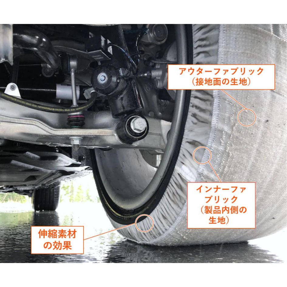コーティングされた織布ネットには、タイヤと路面接触面の間に雪やゴミなどが集まるのを防ぐ働きがあります。