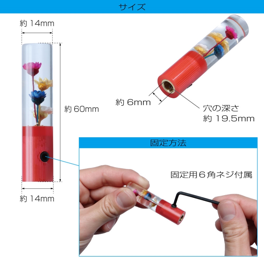 サイズ:タテ:約60mm、幅:約14mmΦ、穴の大きさ:約6mmΦ、穴の深さ:約19.5mm