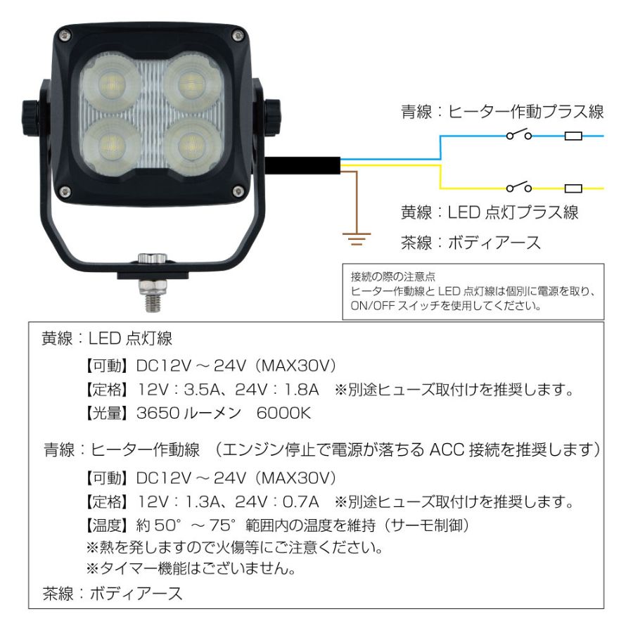 ※LEDランプ点灯とヒーターの電源は個別に別途ON/OFFスイッチとヒューズの取付けを推奨します。