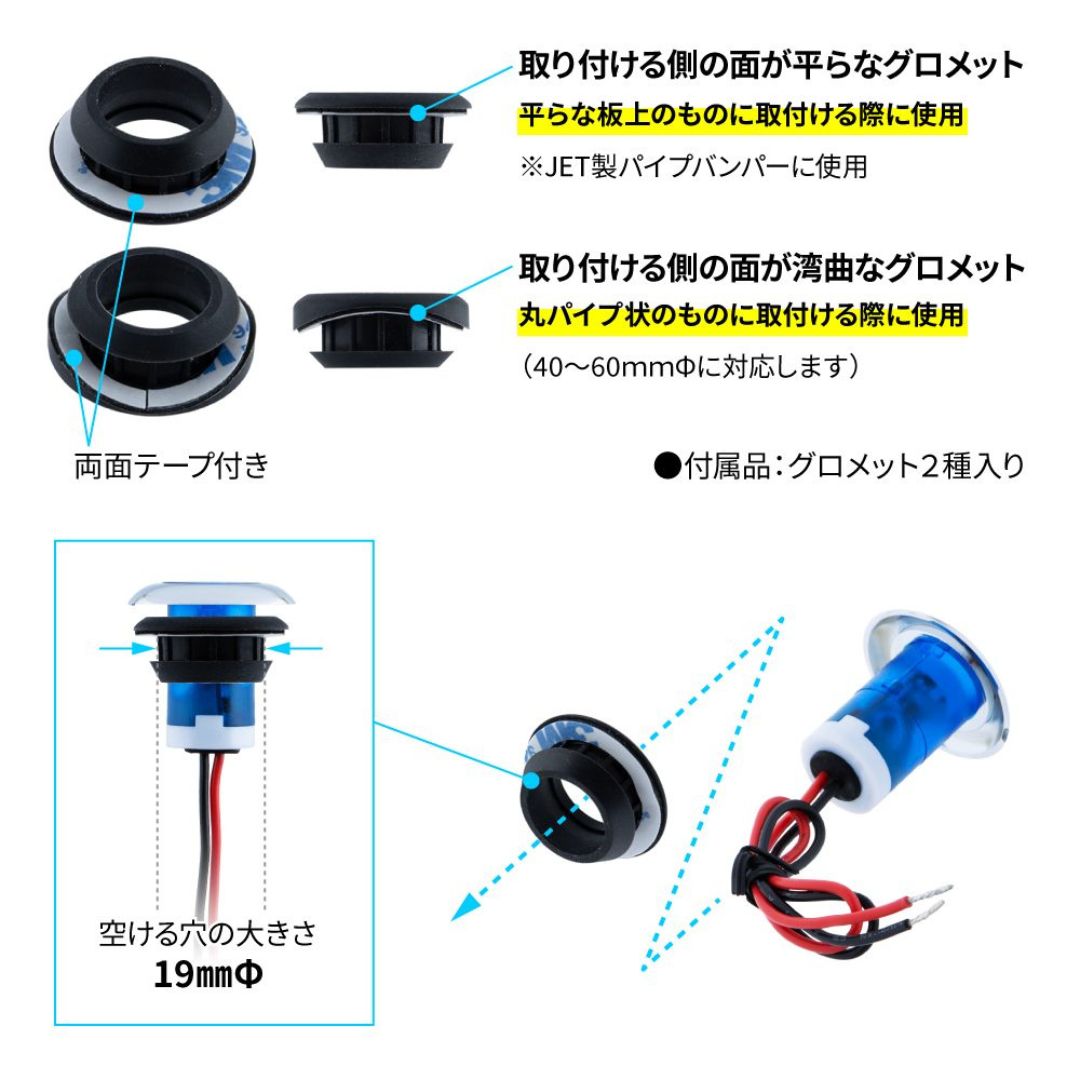 取付ける面がフラットな形状と丸みを帯びたパイプ状の双方に対応できるように2種の台座(グロメット)を付属させました。