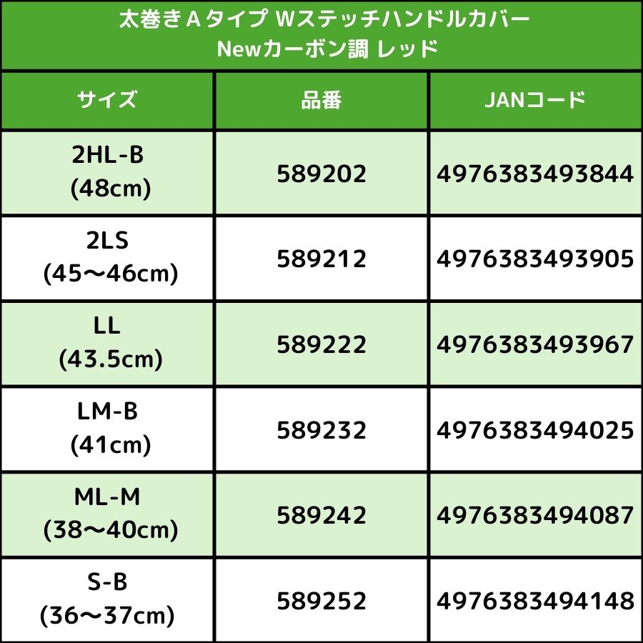 | 2HL-B(48cm) | 589202 | 4976383493844 | 2LS(45〜46cm) | 589212 | 4976383493905 | LL(43.5cm) | 589222 | 4976383493967 | LM-B(41cm) | 589232 | 4976383494025 | ML-M(38〜40cm) | 589242 | 4976383494087 |