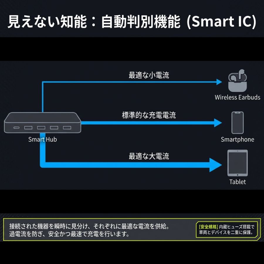 ●機器に合わせて最適な電流を供給して充電する自動判別機能付きです。