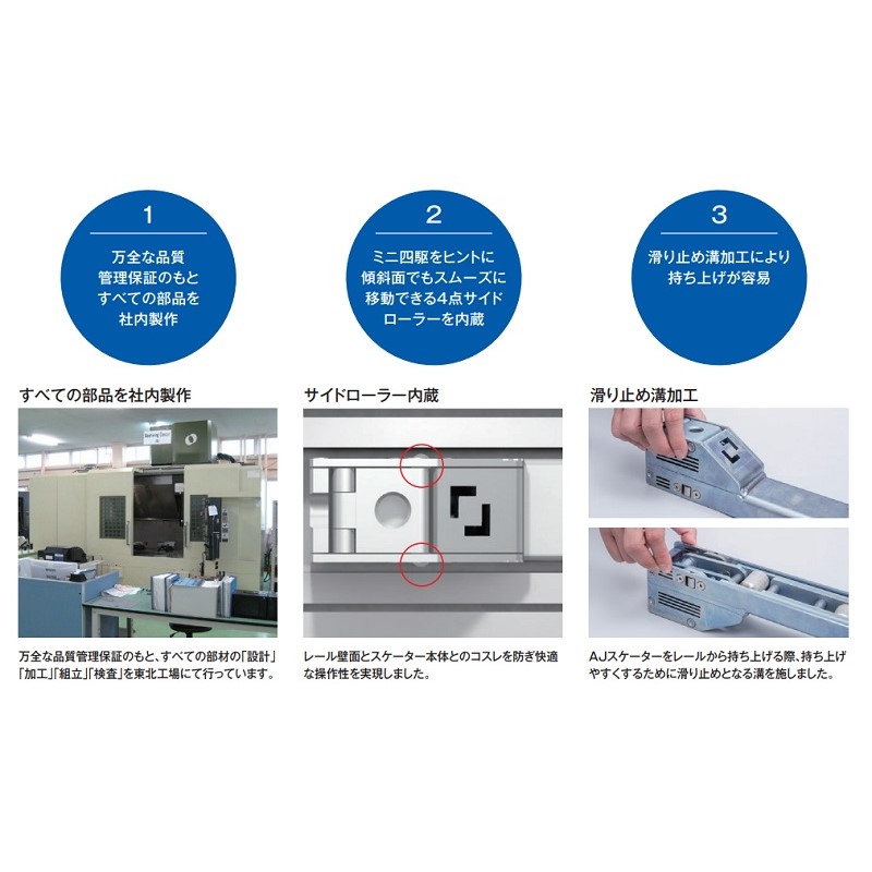 AJスケーターをレールから持ち上げる際、持ち上げやすくするために滑り止めとなる溝を施しています